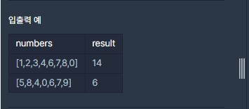 - numbers에서 0 ~ 9 중 없는 수를 더해서 반환하는 solution 함수를 완성하시오