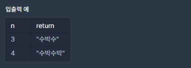 - 예를 들어 n이 4이면 "수박수박", n이 3이면 "수박수"를 반환합니다