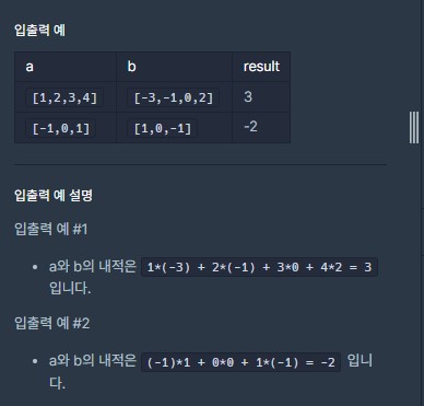 - 배열 a, b의 내적은 a[0] * b[0] + a[1] * b[1] + ... + a[n-1] * b[n-1]