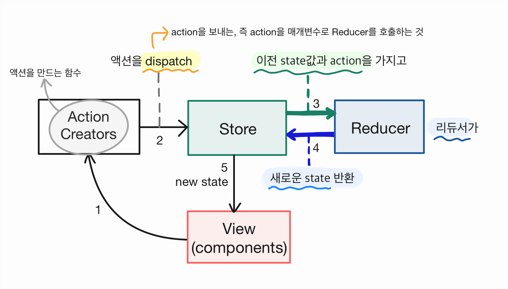 - state를 변경(재정의)하는 방법은 action을 dispatch로 전달하는 거뿐