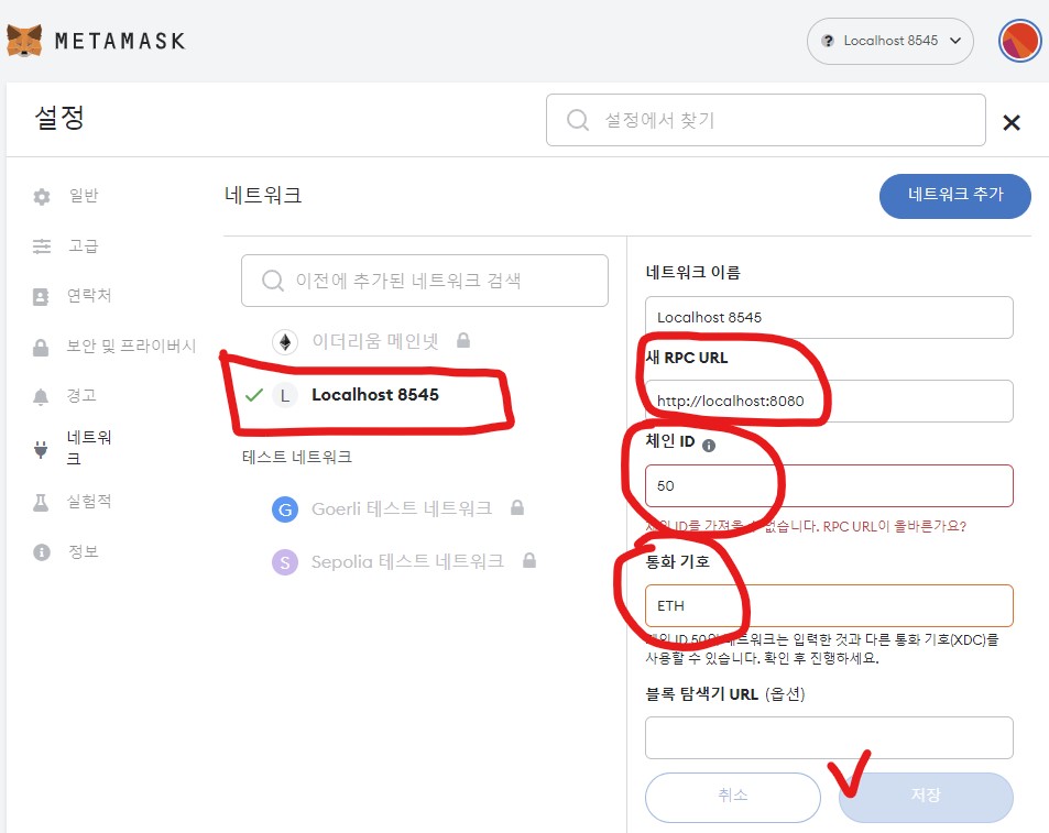 - Localhost:8545가 밑에 테스트 네트워크에 있어도 상관없으니 클릭해서 수정 후 저장을 눌러주자