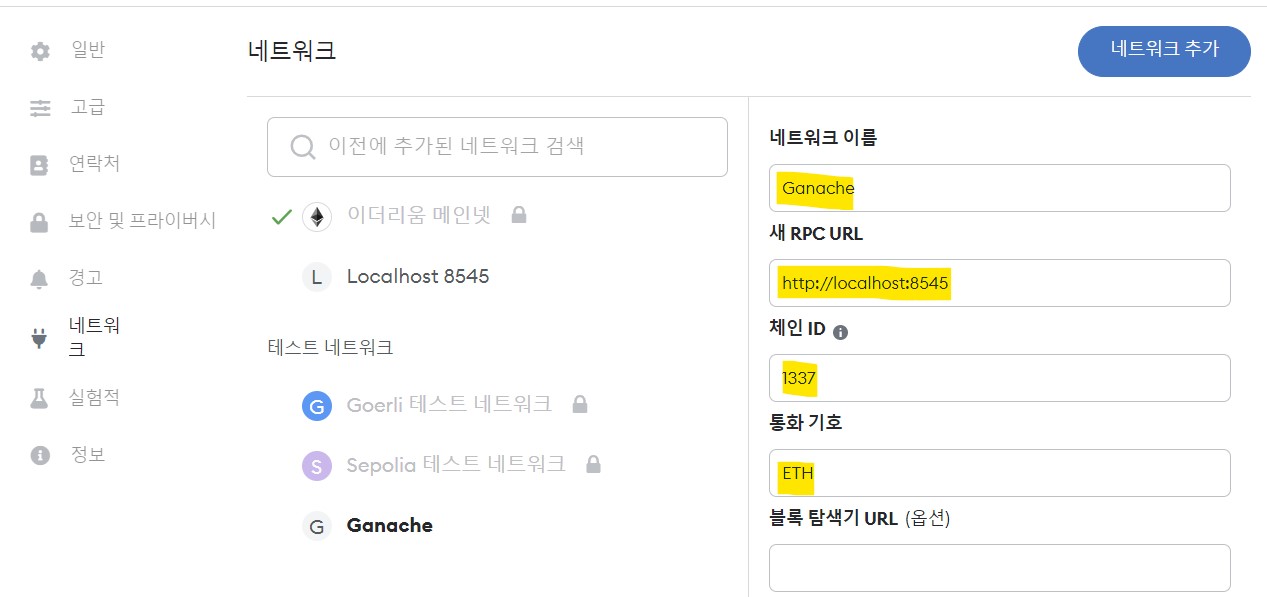 ganache 네트워크 상세 등록