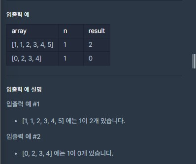 - 배열 array안에 정수 n이 몇 개 있는지 개수를 반환하는 solution함수를 완성하시오