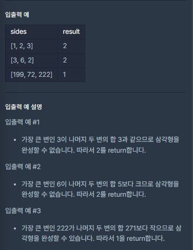 (Programmers) [Lv. 0] 삼각형의 완성조건(1)