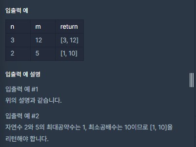 - 반환하는 배열의 첫 번째는 최대공약수, 두 번째는 최소공배수를 담아 반환하는 solution 함수를 완성하시오