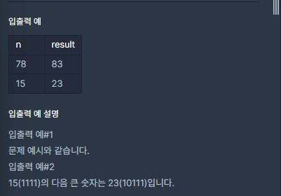 - 조건 2. n의 다음 큰 숫자와 n은 2진수로 변환했을 때 1의 개수가 같다