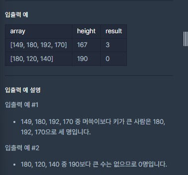 - 이에 머쓱이네 반 친구들의 키를 담은 배열 array와 머쓱이의 키 height를 매개변수로 넘겨받는다