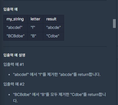 - my_string에서 letter를 제거한 문자열을 반환하는 solution 함수를 완성하시오