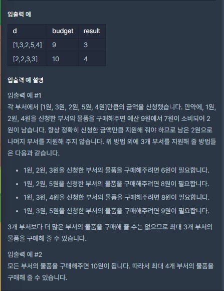 - 부서별로 신청한 금액이 들어있는 배열 d와 예산 budget이 매개변수로 주어진다