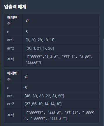 - 전체 지도의 크기는 n, 두 개의 비밀지도를 arr1, arr2이라는 두 배열로 매개변수를 넘겨받는다