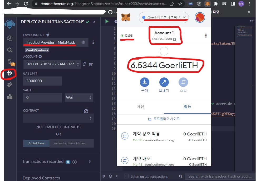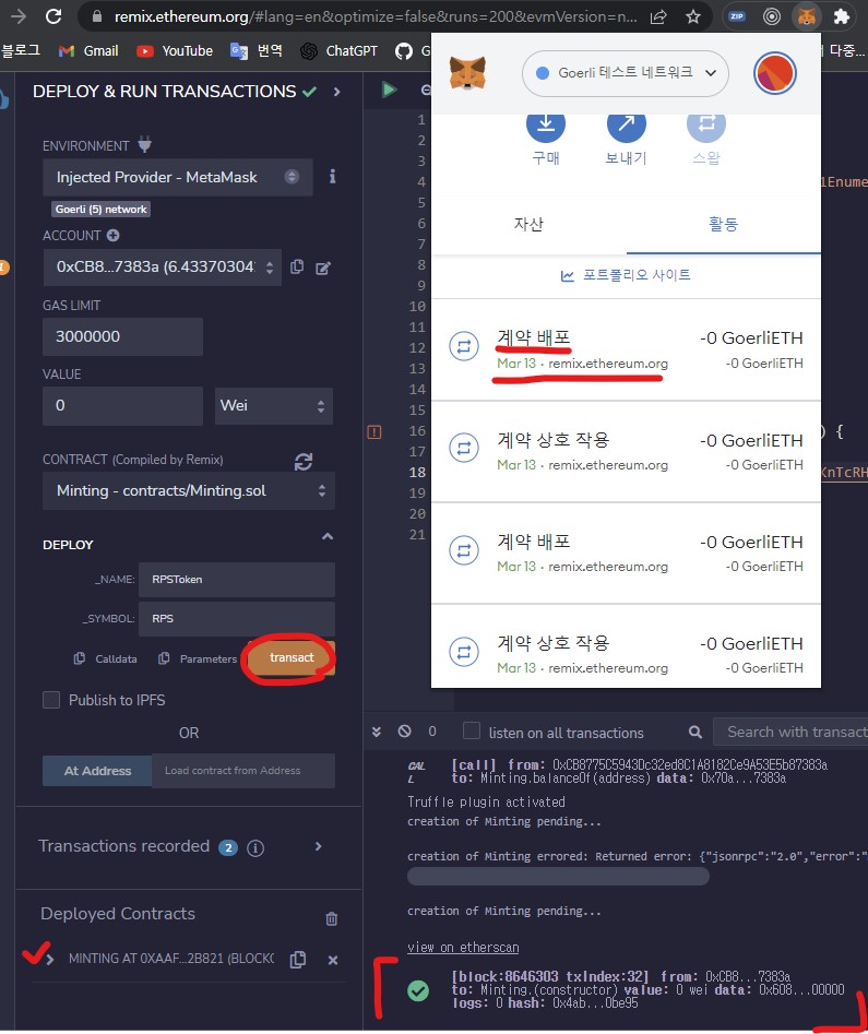 - remix에서 연결된 Metamask 쪽으로 배포(deploy) 및 transact 버튼을 클릭해준다