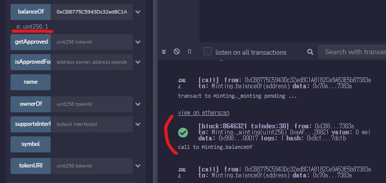 - 성공적으로 트랜잭션이 끝나고 다시 토큰을 조회해 보면 0 → 1로 바뀐 걸 확인할 수 있다