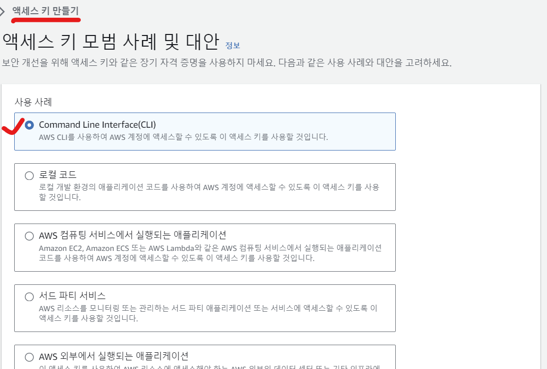 - 해당 사용자 설정에 접근할 수 있는 AcessKey와 AccessSecretKey를 생성해야 한다
