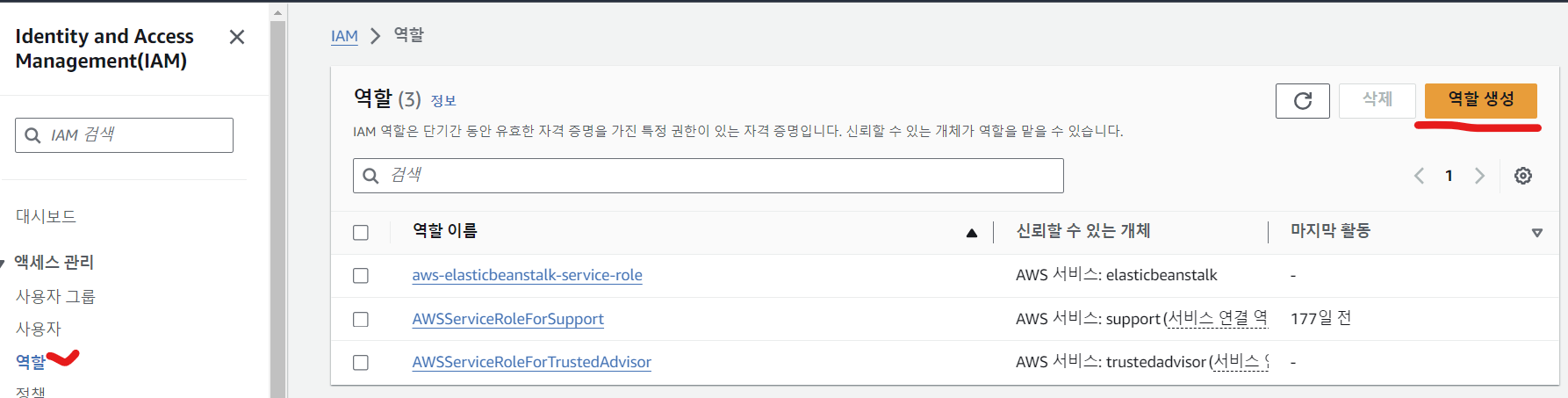- 왼쪽에 액세스 관리 역할을 클릭 후 역할생성을 클릭한다