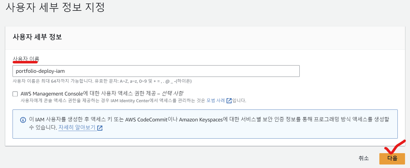 - 사용자이름 (원하는 이름으로) 작성 후 다음을 클릭한다
