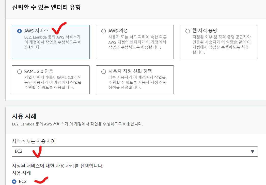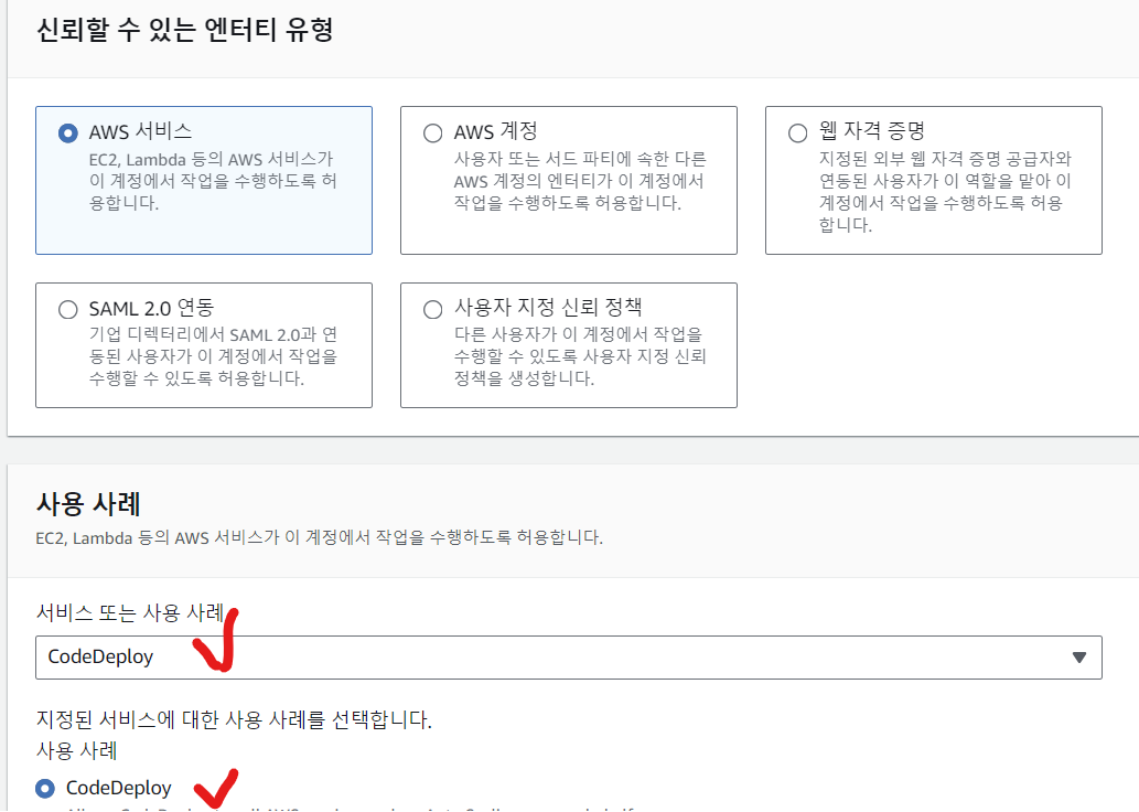 - codeDeploy역할은 선택 후 기본설정으로 완료하면 된다