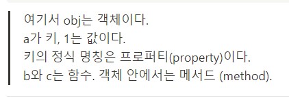객체 : 중괄호에 키와 값(key : value)으로 이루어진 프로퍼티(property) 집합