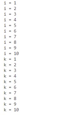 for (let a = 0, b = 1; a < 10 && b > -2; ++a, --b) {