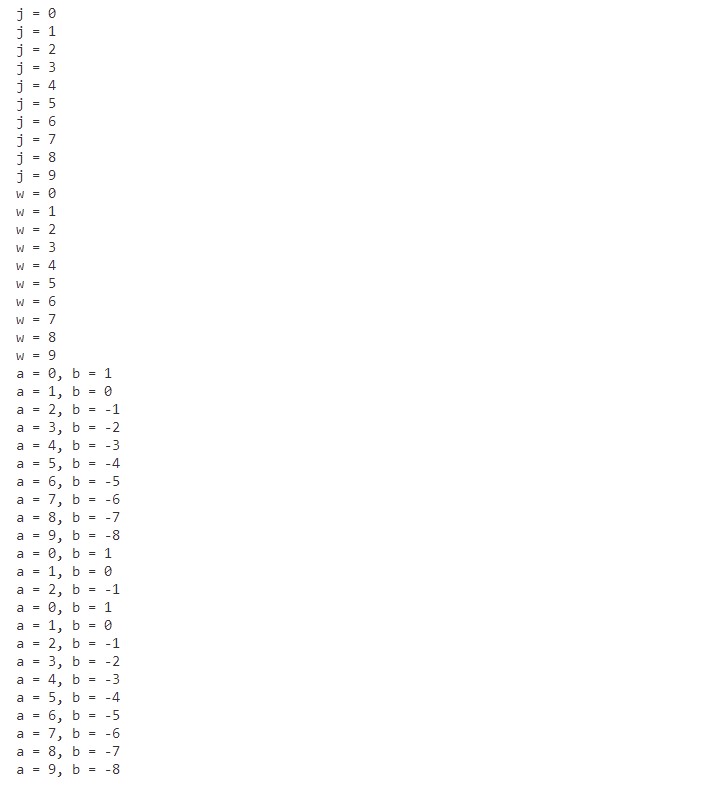 for (let a = 0, b = 1; a < 10 || b > -2; ++a, --b) {