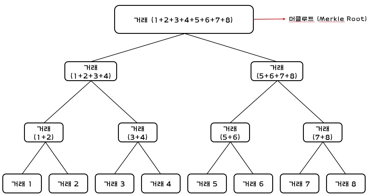 - 데이터를 여러 조각으로 나누며 생성되며, 머클루트를 형성하기 위해 반복적으로 해시화 한다