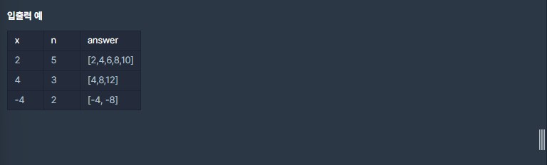 - 함수 solution은 정수 x와 자연수 n을 입력받아, x부터 시작해 x씩 증가하는 숫자를 n개 지나는 리스트를 리턴해야 합니다. 다음 제한 조건을 보고, 조건을 만족하는 함수, solution을 완성해 주세요.