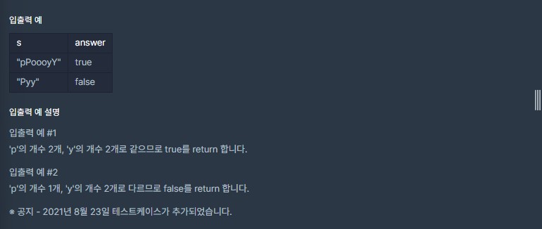 - 예를 들어 s가 "pPoooyY"면 true를 return 하고 "Pyy"라면 false를 return 합니다.