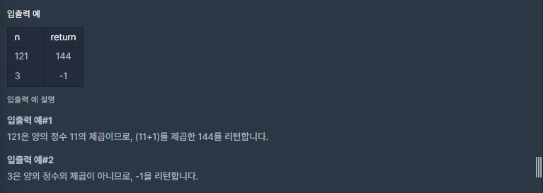 - n이 양의 정수 x의 제곱이라면 x+1의 제곱을 리턴하고, n이 양의 정수 x의 제곱이 아니라면 -1을 리턴하는 함수를 완성하세요.