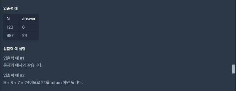 - 예를 들어 N = 123 이면 1 + 2 + 3 = 6을 return 하면 됩니다