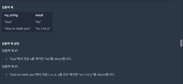 - 영어에선 a, e, i, o, u 다섯 가지 알파벳을 모음으로 분류합니다. 문자열 my_string이 매개변수로 주어질 때 모음을 제거한 문자열을 return 하도록 solution함수를 완성해 주세요.