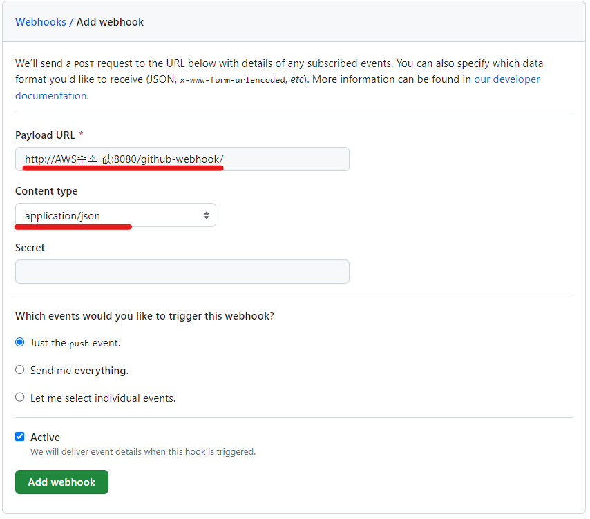 - AWS DNS 주소값:8080(Jenkins PORT번호) + /github-webhook/